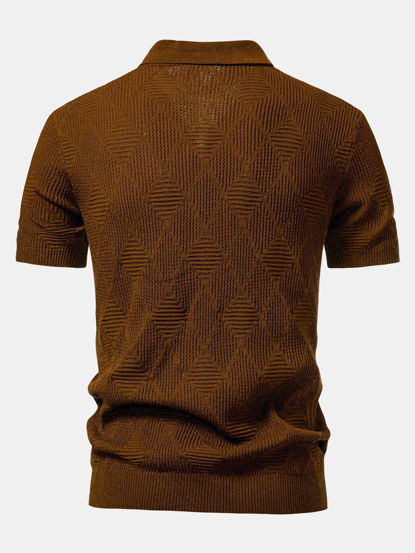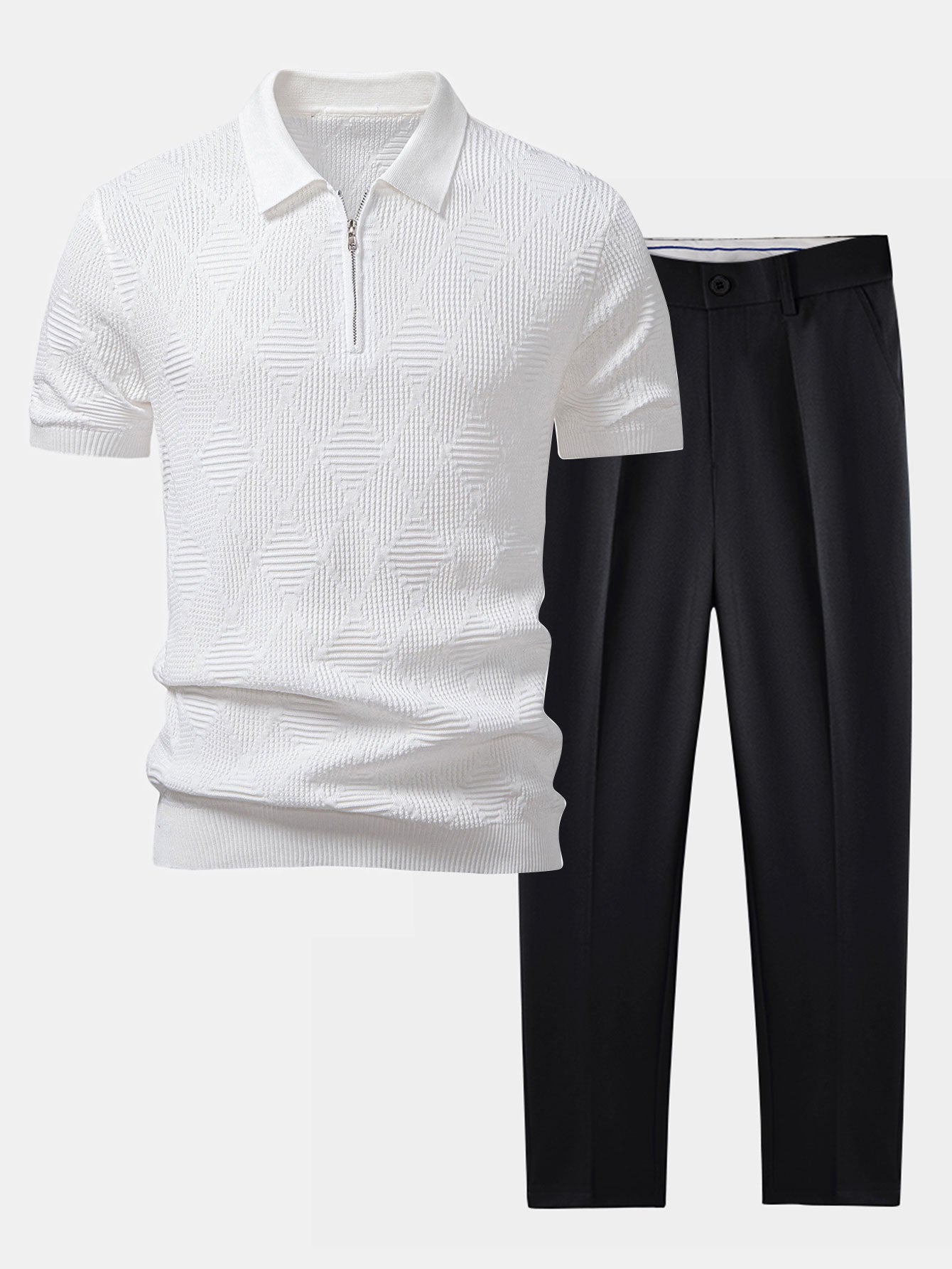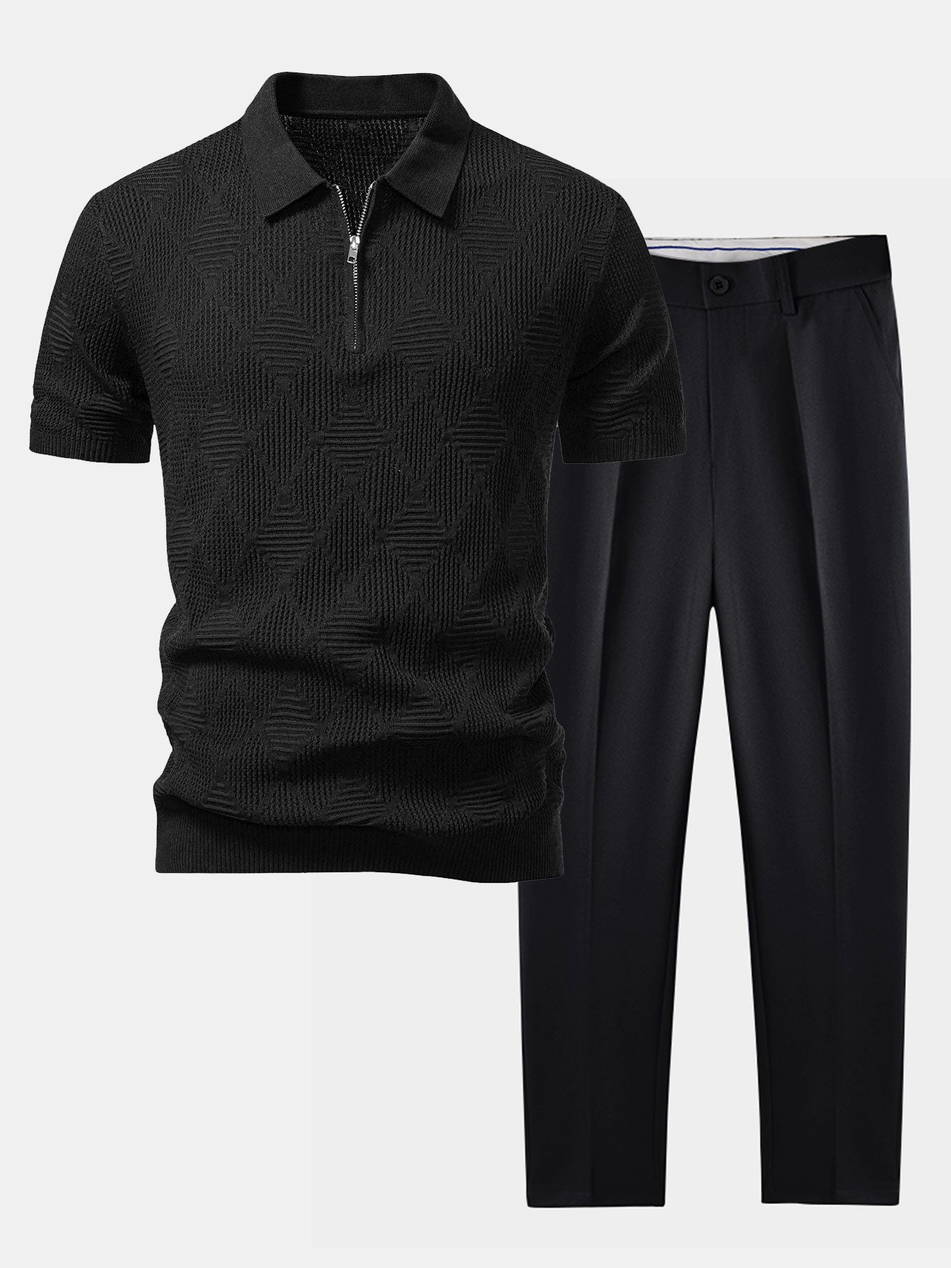 Rhombus Textured Zip Up Knitted Polo Shirt & Slim Fit Tapered Trousers