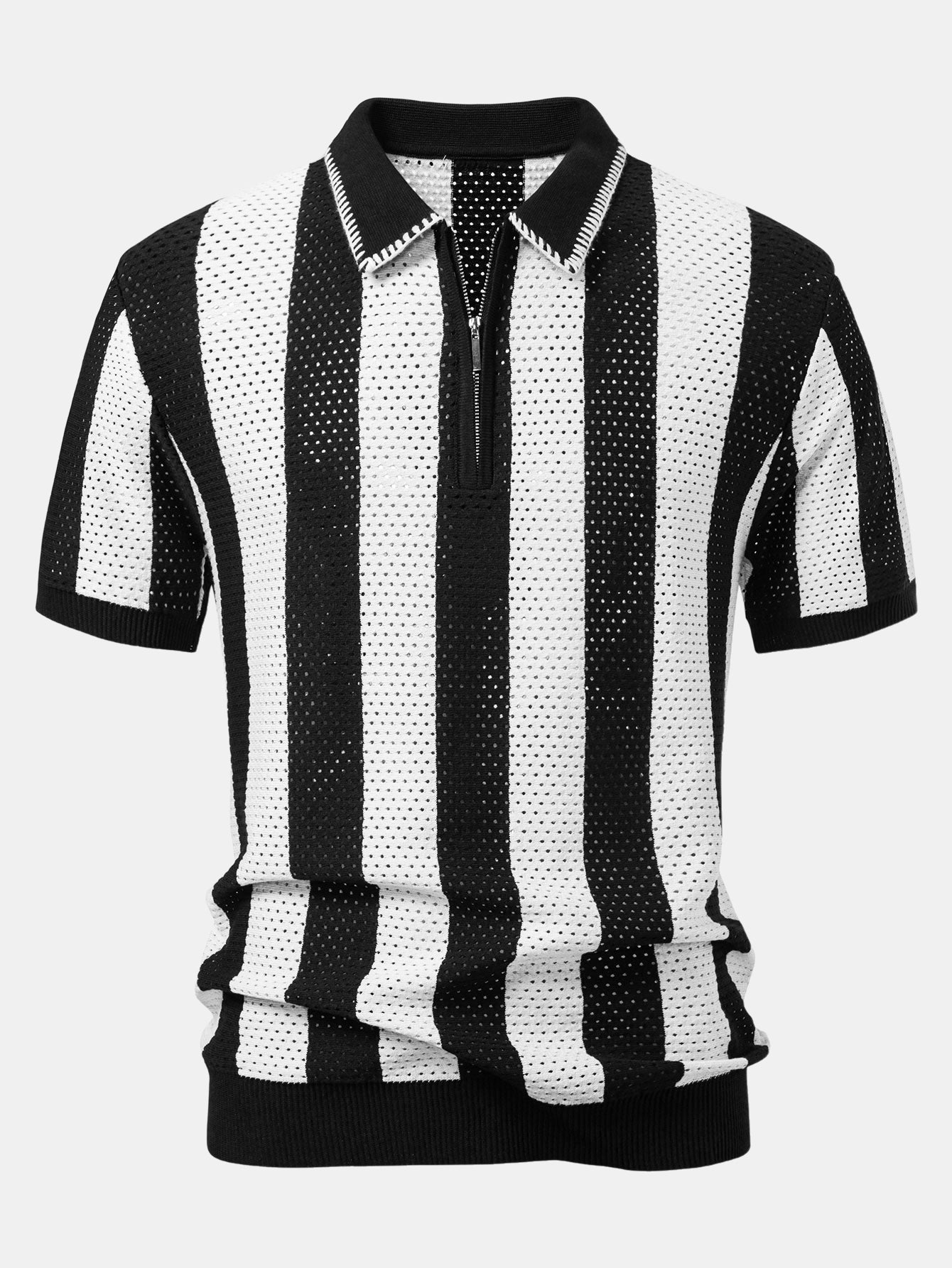Striped Eyelet Knit Zip Up Polo Shirt & Straight Leg Linen Pants